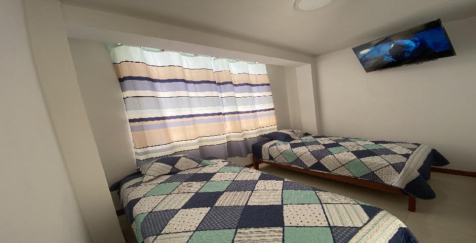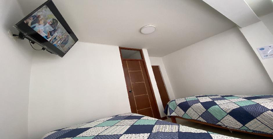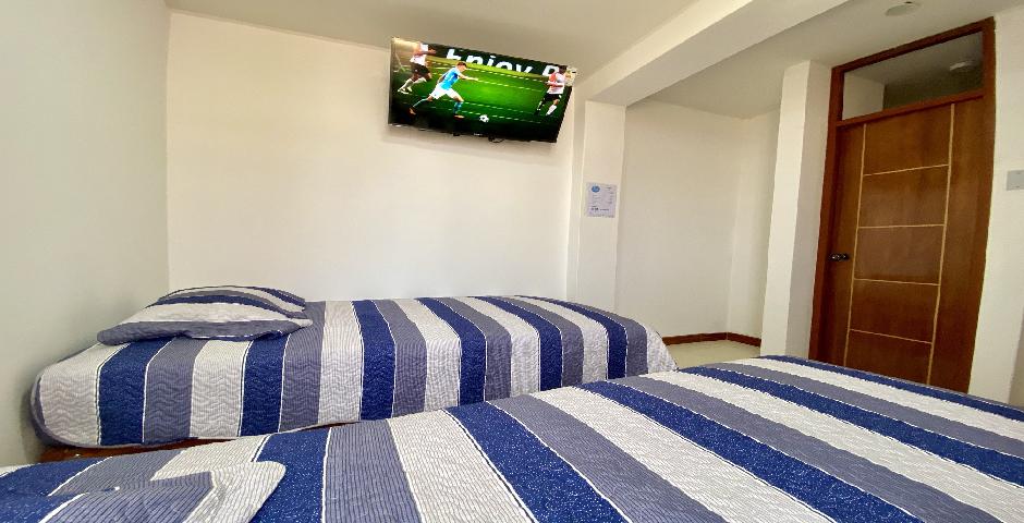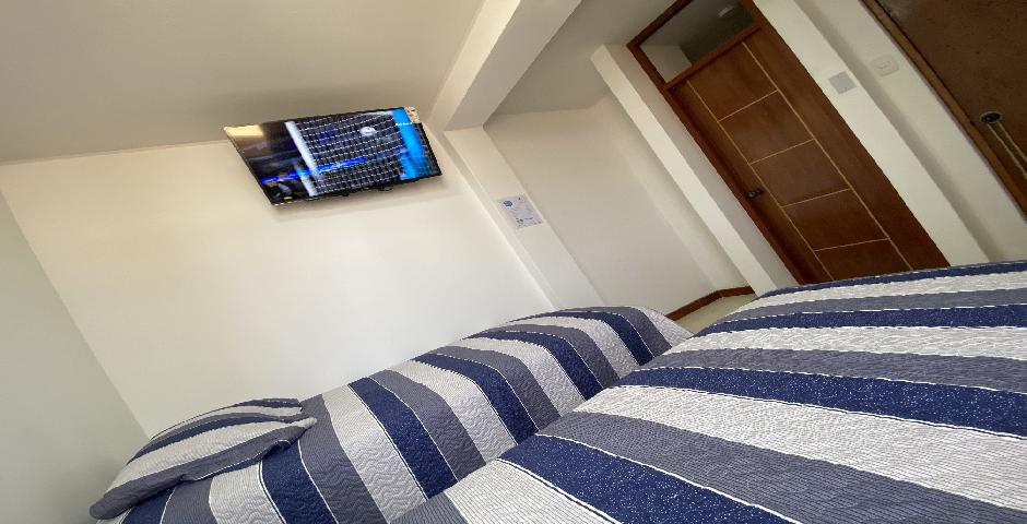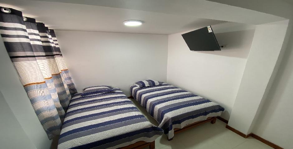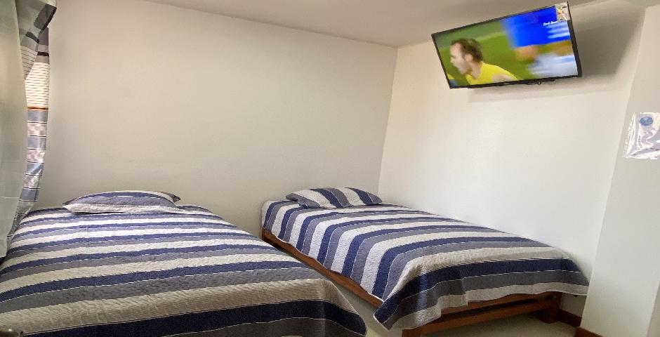 Habitaciones Dobles Este tipo de habitaciones más amplias dispuestas para dos personas con dos camas independientes. Suele ser utilizada por amigos, o compañeros de trabajo que quieren disfrutar de las ventajas del hotel con un precio inferior por persona de lo que supondría una habitación para cada uno de ellos. Cuentan con baño privado, agua caliente, televisor Smart, señal de cable, Wi-Fi y cuenta habilitada de Netflix.